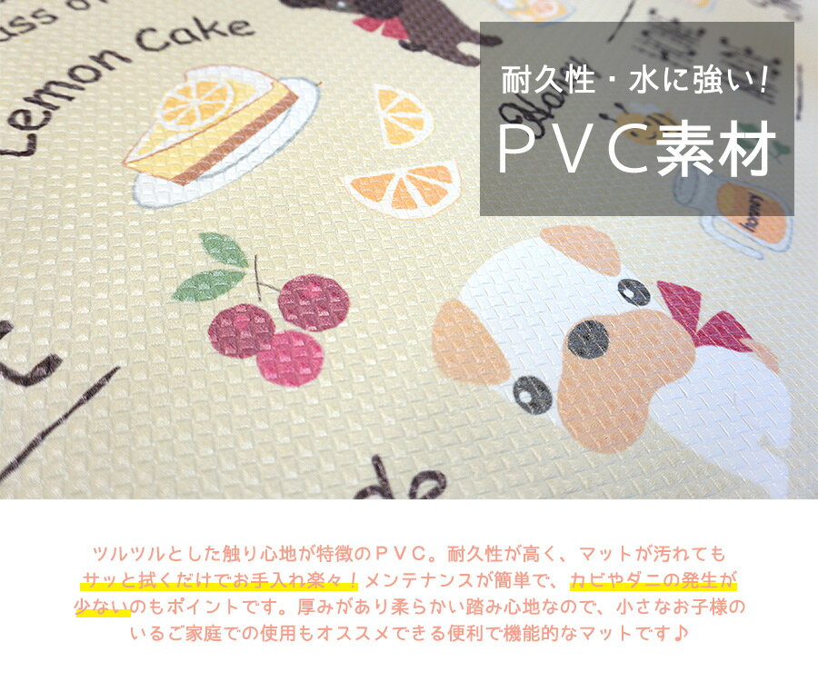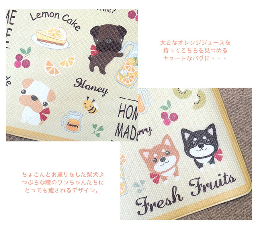 ・フルーツやスイーツ、つぶらな瞳でこちらを見つめるツインドッグのイラストがキュートなキッチンマット。