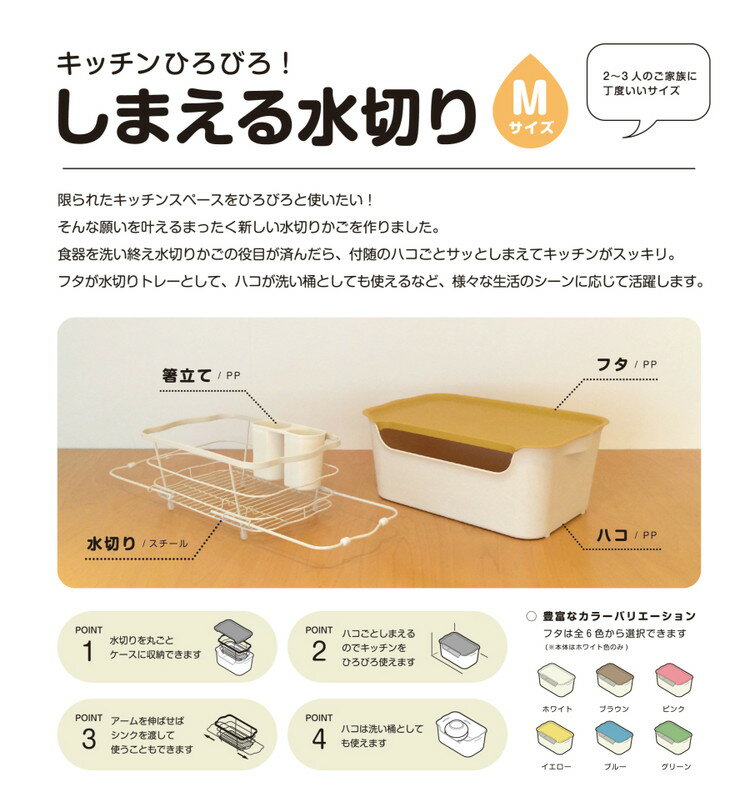 食器を洗い終え水切りかごの役目が済んだら、付随のハコごとサッと しまえてキッチンがスッキリ! フタが水切りトレーとして、ハコが洗い桶としても使えるなど、 様々な生活のシーンに応じて活躍します♪
