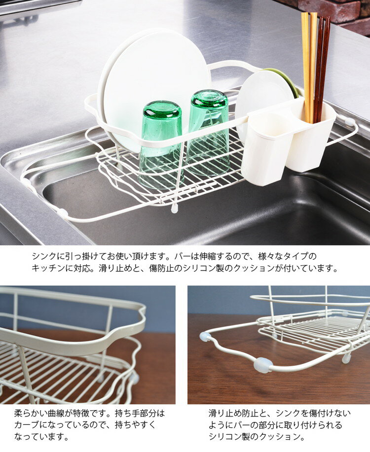 ●豊富な6色のカラーバリエーション 【サイズ】水切り本体:幅約33.5〜57cm×奥行約21.5cm×高さ約13.5cm ケース収納時:幅約38.8cm×奥行約26.3cm×高さ約15.5cm 【耐荷重】約2.5Kg 【重量】約1.35kg 【材質】水切り本体:スチール(カチオン電着塗装+エポキシ樹脂紛体塗装) 箸立て・フタ・ケース:ポリプロピレン 【原産国】日本【代引きについて】こちらの商品は、代引きでの出荷は受け付けておりません。